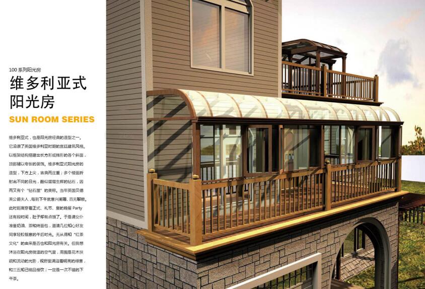 维多利亚式阳光房:维多利亚式,也是阳光房经典的造型之一。它沿袭了英国维多利亚时期的宫廷建筑风格。以框架结构搭建出长方形或者梯形的各个斜面,顶部辅以夸张的装饰。维多